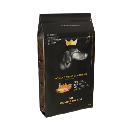 La nourriture sèche Comme Un Roi Poulet et Agneau se rapproche de l’alimentation originelle du chien qui se nourrissait de proies et de baies. Elle est très riche en protéines (82%) à base de poulet frais (60%) et d’agneau déshydraté (22%). Elle est aussi sans céréales et avec des pommes, du potiron, des pois et des patates douces à faible indice glycémique, permettant de réduire les glucides non nécessaires à l’animal. Le tout est complété de prébiotiques et de probiotiques naturels pour aider la digestion et soutenir l’immunité.