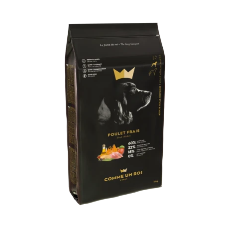 Les croquettes sans céréales Comme un Roi Poulet sont élaborées avec 82% de poulet dont 60% de poulet frais et 22% de poulet déshydraté. Très riches en protéines, elles sont aussi sans céréales et à base de pommes, potiron, pois et patates douces à faible indice glycémique, car les glucides ne sont pas nécessaires à l’animal.