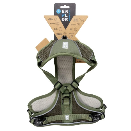 Sortez avec le harnais EXPLOR Ultimate Fit No-Pull, un harnais pour chiens bien pensé, ergonomique et idéal pour une promenade quotidienne en ville ou une grande aventure en plein air. Votre chien jouit d’une liberté de mouvement optimale car la pression causée par la traction est répartie uniformément autour de la poitrine. Les organes vitaux du cou restent ainsi protégés. Le harnais présente deux anneaux de fixation en acier inoxydable : un sur le dos, adapté aux chiens calmes ou plus âgés que vous pouvez bien garder sous contrôle, et un anneau en D renforcé sur la poitrine pour guider les chiens tirant sur la laisse. Le harnais EXPLOR Ultimate Fit No-Pull est réglable autour du cou et de la poitrine, ce qui le rend parfait pour presque tous les chiens en combinaison avec les matériaux durables. Les boucles sont situées autour de la taille, de sorte que le chien n’a pas à lever sa ou ses pattes pour mettre le harnais. Pour protéger le pelage et la peau du chien des abrasions, la plupart des sangles et des boucles sont recouvertes de matériaux doux et respirants. De plus, les tissus légers mais qualitatifs qui ont été utilisés à la fois pour l’intérieur et l’extérieur sèchent rapidement : très pratique si votre chien aime nager. Pour éviter que votre chien ne reste coincé sur les branches lorsqu’il se promène librement, le harnais n’a pas de boucles ou de parties saillantes. EXPLOR Ultimate Fit prend également en compte la sécurité de votre chien dans la circulation. Les bandes de couture réfléchissantes sont placées aux bons endroits pour une visibilité optimale dans la circulation. Une poche intérieure spacieuse dans la partie poitrine du harnais a également été fournie pour une étiquette d’identification. L’étiquette est facilement accessible et reste intacte. Sortez et EXPLOREZ !